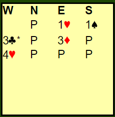 3 kløver viste minst fire-korts støtte og ca. 6-9 poeng. Østs 3 ruter var invitt til utgang, og vest aksepterte invitten.