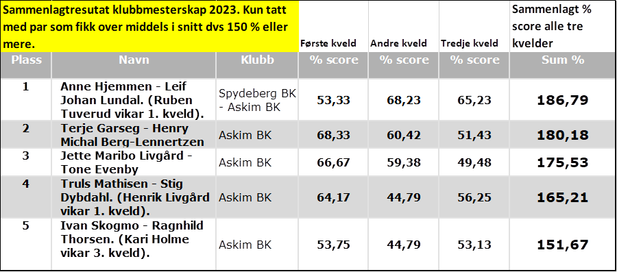 Kveldens resultat. Gratulerer til vinnerne, Sven Arne og Kjell Erling.