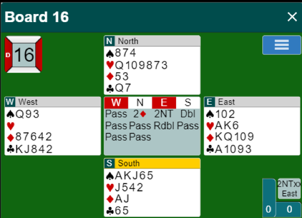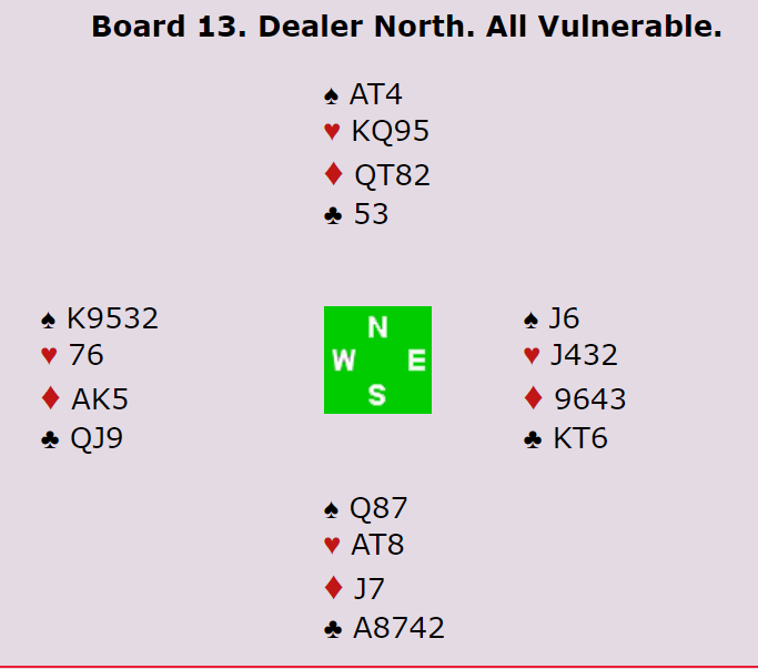 Nei, slemmen ble vunnet. Men det var fordi vest gjorde en ganske grov feil idet liten kløver ble spilt fra syd, han la i kløver 10! Esset vant, så kløver mot syd, og knekten kom på, syd stakk over med damen og vest med kongen. Nå sto kløver 9 og kunne ta ut vest sin siste kløver.