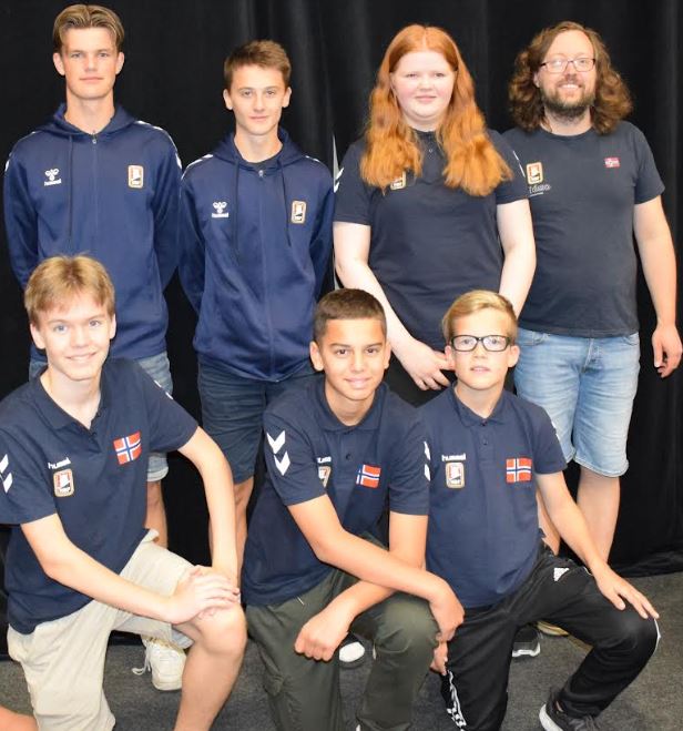 U-16 laget: Stående fra venstre Einar Osen, Kristian Dalemark Austad, Ida Kristine Mathisen og Kristian B. Ellingsen (NPC). Foran fra venstre: Jonas Brekke, Sebastian Lillejord og Markus Hansen Moe. (Foto: Ragna Gunn Bye)
