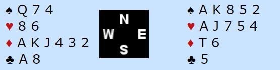Etter det utspillet ser det nokså safe ut å ta ut trumfen som sitter 3-2, så seile ruter 10. Det er 100% hvis ruter sitter 3-2. Da er det nok stikk selv om ruter dame sitter hos nord, øst har jo hjerter ess i behold. Det er imidlertid en hake ved det prosjektet siden hele spillet ser slik ut:
