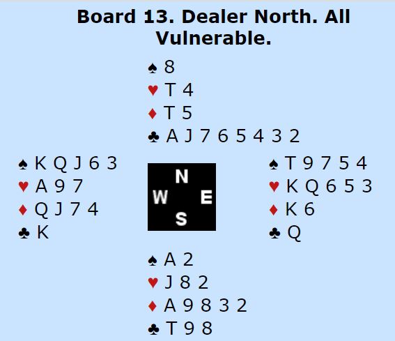 Dette er vel egentlig litt tynt for slem, men med veldig snill sits, 3-2 både i ruter og spar, kan det noen ganger bli tretten stikk i sparkontrakt. I meldingene fikk imidlertid Ø/V vite at det sannsynligvis ikke satt så snilt. Nord passet og øst åpnet med 1 spar før syd hoppet inn med en sperremelding, flere steder 4 kløver, noen steder 5 kløver. Da er det ikke så lett å melde med styring.