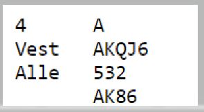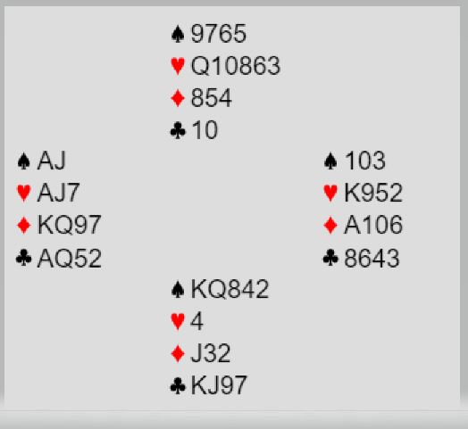 Der Christian Bakke satt øst og Marianne Harding vest startet det med 1 spar fra syd, dobler fra vest og 4 spar fra nord. Nå sa Bakke 4NT – to steder å spille – og vest valgte å vise kløveren. Hun hadde imidlertid nok til å ta sjansen på slem følte hun og sa 6 kløver. Bakke korrigerte til 6 ruter som ba vest velge mellom de to fargene, og 6 ruter ble kontrakten.