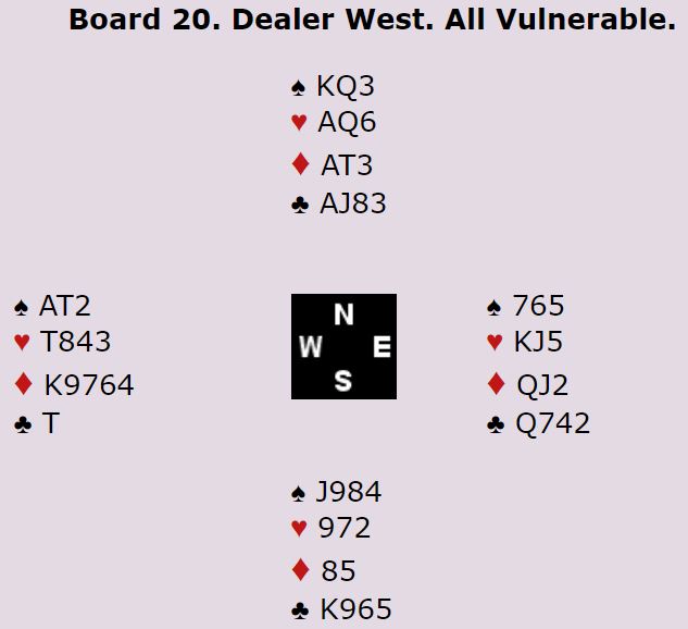 Syd spilte ved de fleste bordene ut sin single hjerter. Mange vant hjerterutspillet med damen og spilte ruter til kongen og esset. Derfra kom hjerter til stjeling, Nå er spillefører i trøbbel og fikk vanskeligheter med å både få tatt kløverfinessen som for så vidt løser den fargen enkelt, og i tillegg tatt to sparfinesser. Slik det gikk var det mange som gikk en bet, og noen gikk to bet i denne normale utgangen.