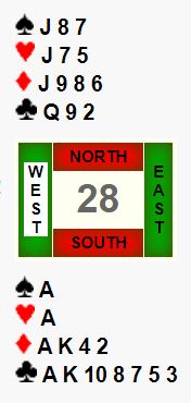 Brogeland sa imidlertid 4NT først, "to steder å spille". I første omgang tar makkeren det som begge minor. Bakke (nord) sa 5 ruter, og da meldte Brogeland 6 kløver. Nå har han antagelig vist noe slikt som dette så nord kan korrigere til 6 ruter om han har for eksempel singel kløver og 4-5 rutere?