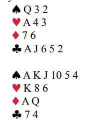 Problemet er inntakene, og det som i alle fall ikke bør gjøres er å ta tre under trumf om trumfen sitter 3-1. Hvis kløver ikke sitter veldig snilt må du ha nok inntak til både stjele to kløvere, og senere hente den femte, godspilte kløveren. Det betyr tre inntak, to til å stjele kløver, ett til å hente det godspilte stikket. Spar dame, hjerter ess og kløver ess er tre inntak. Men du kan ikke spille kløver til esset og mer kløver, i så fall har du kun to inntak igjen der borte.