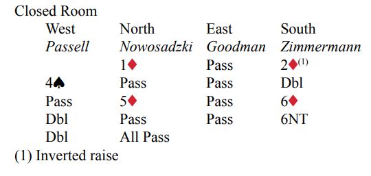 Det er så en nesten må gni seg i øynene. Det blir ganske kostbart i 6 ruter doblet også, men 6NT doblet ble helt latterlig. Spillefører skrapte sammen seks stikk, seks doblede bet i faresonen, dvs. GOODMAN +1700. Da var det ikke så mye å komme med +850 likevel, 13 IMP til lag GOODMAN. ZIMMERMANN vant likevel semifinalen ganske komfortabelt, og de fulgte altså opp med å vinne finalen. ZIMMERMANN er dessuten regjerende mestre i REISINGER.