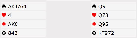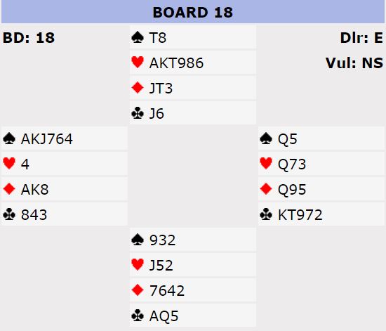 Det gikk altså hjerter til esset fulgt av tieren, og øst la liten. Da ramlet taket i hodet på spillefører, hjerter konge tok med seg damen og det ble seks hjerterstikk til nord. I tillegg har N/S to kløverstikk, og for sikkerhets skyld ble øst så frustrert etter den triste starten at han kastet tre kløvere fra øst slik at syd fikk tre kløverstikk - fem bet i 3NT!
