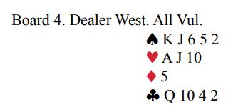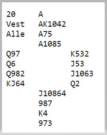 For SVEITS meldte nord 4 spar og ble spillende der. Nord har gode kort og ser selvsagt at det kan stå slem, men har også litt lyst til å beskytte syd som har doblet opplysende i en presset situasjon og følgelig ikke behøver å være så sterk at slem er bra. Men denne gangen var det slem i kortene.