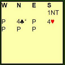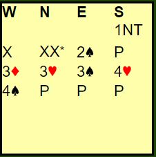 Syd åpnet med 1NT ved begge bord. Kristian B. Ellingsen doblet med vests kort, og nord redoblet som jeg antar ba om at makkeren skulle si 2 kløver så kunne nord passe eller melde sin farge for å spille der. Men Peter Marstrander (øst) sa 2 spar. Etter pass fra syd kom 3 ruter fra vest og nord prøvde 3 hjerter. Øst gjentok sparfargen, og vest løftet til 4 spar. Hele meldingsforløpet ble altså slik: