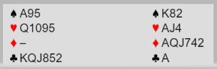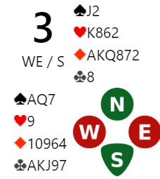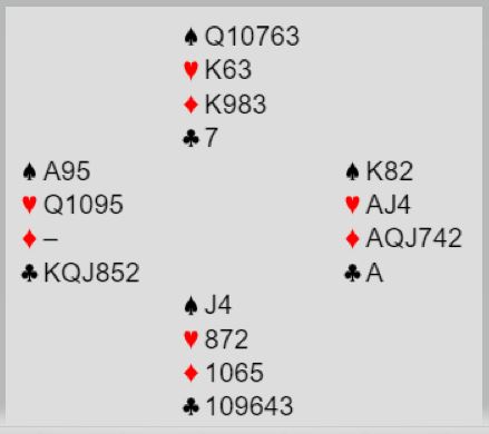 Ved det andre bordet åpnet nord med 2 spar, spar og en minor og under åpningsstyrke. Øst for Bergen Ak doblet, og vest krevde med 3 spar. Da gikk øst på til slem og foreslo etter hvert 6 ruter. Øst korrigerte naturlig nok og foreslo 6 hjerter før øst avsluttet med 6NT. Hvordan bør den kotnrakten spilles etter spar knekt i utspill fra syd?