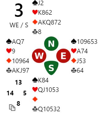 Sunndalsøras øst åpnet etter pass fra nord med 1 ruter og hoppet til 3 ruter over svaret 1 hjerter. Er egentlig litt overrasket over at vest ikke svarte 2 kløver, men det er en annen historie, og jeg kjenner ikke helt avtalene deres. Hoppet til 3 ruter er vel litt en undermelding for de fleste da det vanligvis viser rundt 16-17 etter et 1-over-1 svar. Men hva skal øst si? Vest avsluttet med 3NT i et medingsforløp hvor både Ø/V kanskje meldte litt "soft". Og dette må da være en bra slem?