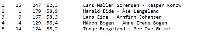 Men toppen gikk til lederlaget som fikk TOLV STIKK i 3NT!!! Hvor de stikkene kom fra kan en stusse på, og jeg har sendt en hendvendelse nordover for å få svar på det. Uansett, det var en ren topp på veien til ledelse før avslutningen av turneringene.