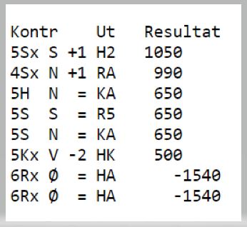 Det norske paret var det eneste i storeslem. Kun fire par var i slem, men et trinn lavere enn det norske paret. Like mange som var i lilleslem spilte utgang, og noen trodde det var mis-fit (eller de hadde en misforståelse) og stoppet i delkontrakt!