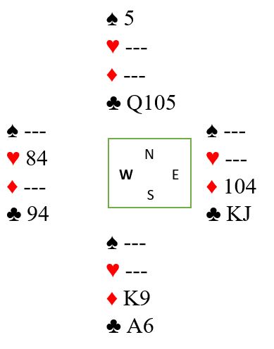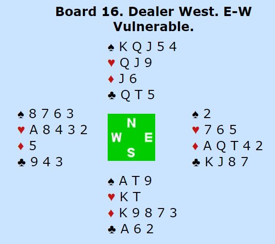 Etter spar 6 i utspill (nest høyeste) fant vest ut at sparfargen kanskje ikke var så god, og idet han kom inn på spar konge i første stikk fant han skiftet til kløver 8 selv om han så knekten femte hos blindemann. Dermed fikk Ø/V i tillegg til sparstikket tre kløverstikk idet øst kom inn på ruter konge. Altså fem motspillstikk, en bet og Danmark +100.