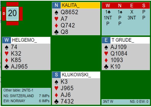 Norges ledelse i kampen krympet etter dette spillet, men like etterpå fikk Helgemo-Grude tatt Bilde-Schaltz i 2 kløver doblet. Tre bet og +800 ga 11 IMP til Norge som vant kampen med med 17 IMP.