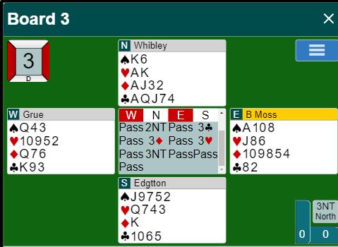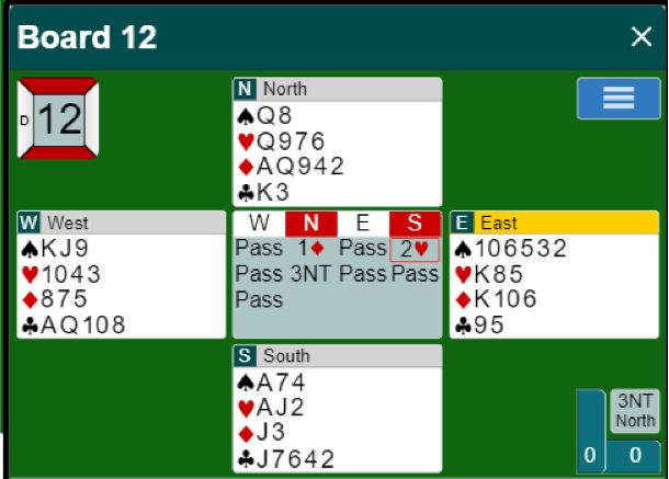 Nitten av tredve N/S-par var i 3NT. Elleve av dem vant den, åtte gikk bet i 3NT.