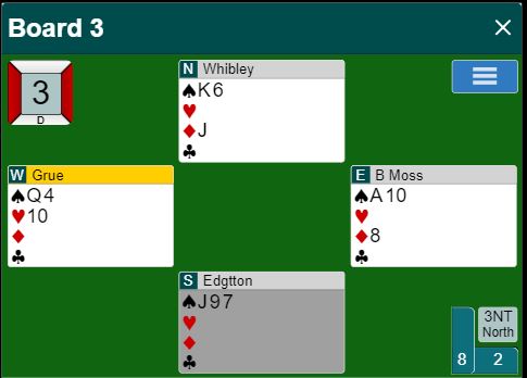Ved det andre bordet kom spar 2 i utspill. Da visste ikke vest om spar tilbake var tingen eller ikke, og kløverskift kan jo være helt tullete om kløveren ser annerledes ut og øst for eksempel har spar dame. Det kom et lignende spill mot 3NT like etterpå, også da spar 2 i utspill, men i det spillet hadde utspilleren Q-10 femte i spar.