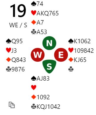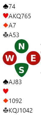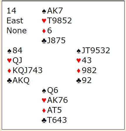 De fleste spilte utgang i hjerter eller grand. Noen veldig få par var i 6 hjerter og vant den. Det er imidlertid alt for hardt, og kløver ut fra syd beter slemmen. Om det kommer kløver ut rekker ikke spillefører å få spilt tre runder trumf før de fire sparstikkene må tas med avkast av kløver. Dessuten er det jo heldig at det er fire sparstikk, og i hjerterfargen må det også unngås to tapere.
