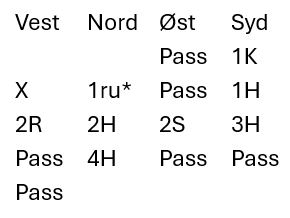 Marianne (vest) åpnet med 1 kløver, og Ann Karin svarte 1 ruter som viser minst firekorts hjerter. Nå tenkte syd at det at de bruker overføringssvar må vi kunne utnytte og doblet for å vise ruterfarge. Det skulle hun ikke ha gjort.
