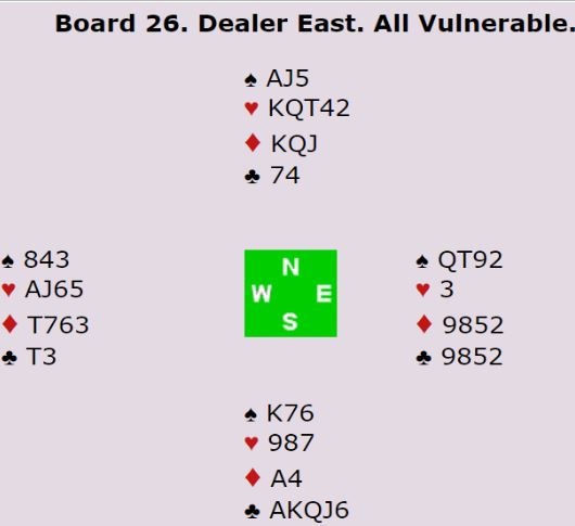 Vest spilte ut spar konge til esset. Så kom ruter fra nord. Med åpne kort ser man at 3NT kan betes. Da må øst gå på med honnør idet ruter spilles fra nord. Øst får i så fall to raske inntak i ruter og kan idet han kommer inn på det første ruterstikket skifte til kløver. Spillefører rekker ikke å få tak i mer enn 1+5+1+1 = 8 stikk. Men øst kan neppe kritiseres veldig for ikke å legge i stor ruter da det godt kan hjelpe spillefører til å løse ruteren best mulig for han. Og øst aner ikke så mye om hvordan resten av kortene ser ut. Så øst la liten ruter, og spillefører vant stikk for ruter 7. Med to ruterstikk i boks behøvde spillefører kun ett kløverstikk for å komme til ni stikk (1+5+2+1=9). Dermed ble det +600 til N/S ved det bordet som sammen med 140 ga 12 IMP ut for det norske laget.