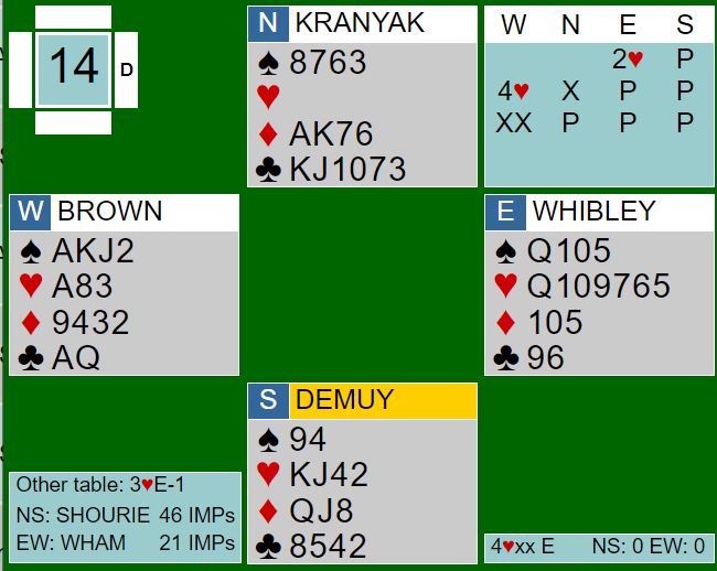 Kontrakten 4 hjerter redoblet går bet med kløver ut. Hjerteren må i så fall tippes for å få ni stikk, men det valget ble ikke vanskelig for Wibley slik meldingene hadde gått. Det blir også bet med for eksempel ruter dame ut som må være et alternativ for syd. Han får det stikket og kan skifte til kløver. Kanskje bør nord legge svakhet i ruter for å få kløver i skift fra syd? Eller nord kan stikke over den første ruteren og spille ruter til syd som i så fall trolig finner kløverskiftet. Om han får for ruter dame kan syd også ta for knekten i andre stikk før det skiftes til kløver. Da får forsvaret minst fire stikk.