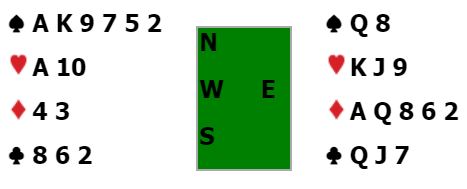 Men dette er ikke godt nok spilt siden det er en nesten 100% sjanse her. Det er nesten sikkert at nord startet med fire kløver og syd kun trekorts farge. Dermed er det bare å ta den tredje sparhonnøren og så gi bort stikk til syd for hans fjerde trumf. Hva har syd igjen da? Bare ruter og hjerter, og samme hva syd spiller er det favør som sikrer kontrakten. Slik så hele spillet ut fra start: