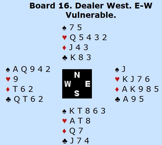 Det var ved det andre bordet det virkelig skjedde saker og ting. Kåre Bogø åpnet som øst med 1 ruter, og syd gikk innpå med 1 spar. Det er ikke så mye å si på det utenfor sonen, men denne gangen gikk det galt. Ranja Sivertsvik passet, og etter pass også fra nord gjenåpnet Bogø med en opplysende dobling. Da var det ingen som hadde noe mer å si, så det ble sparkontrakt Ø/V ved det ene bordet, N/S ved det andre bordet.