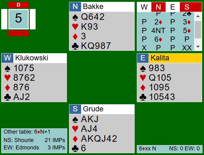 I omtalen av ett av spillene hvor det kunne bli tolv-tretten stikk skrev jeg noe sånt som «...egentlig ikke en slem som bør meldes, for så mange stikk blir det bare fordi motpartens kort sitter veldig fordelaktig for spillefører». I ettertid må det innrømmes at det egentlig er en slem som er bra å melde hvis en ser på hvor stor sjanse det er for å vinne nok stikk. Men det er ikke så lett å vite når man melder og ser kun sine egne kort, og i forhold til antall HP til sammen er det normalt for lite til å melde slem med stor sannsynlighet for å vinne den.