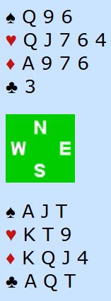 Ved det andre bordet meldte øst inn kun 1 spar. Da fikk syd hoppet til 3 kløver. Det fulgte en lang meldeserie som jeg ikke kan si så mye om uten å kjenne parets avtaler. Syd sa til slutt 6 kløver, men nord avsluttet med 6 ruter. De hadde funnet toppkontrakten som dog måtte spilles litt forsiktig. Men alle som var i 6 ruter (fire av åtte N/S-par) vant den, og en av dem fikk tretten stikk. Det norske paret var alene om å gå bet i 6 kløver. Ett N/S-par til gikk bet i slem, men de var i 6NT. Dessuten var to N/S-par kun i utgang.