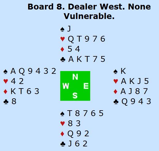 Palma (vest) åpnet med 2 spar. Nord har en ekkel hånd. Sånn er det jo ofte om det må vurderes å melde over en sperreåpning, og man er jo alltid litt bekymret for å bli robbet hvis man ikke melder, eller straffedoblet hvis man melder. Det er nesten nok til å melde, og det kan bli rett å kaste seg innpå om makkeren har tilpasning. Men det er i minste laget, og da nord likevel slengte innpå 3 hjerter var det over.