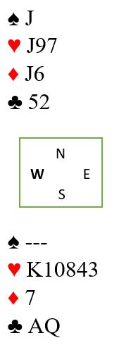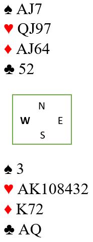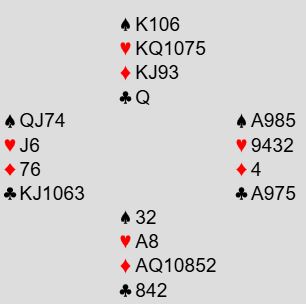 Utgangen som står er 4 hjerter med kun syv trumf til sammen, og det er ikke lett å finne frem dit. I hjerterkontrakt kan ikke Ø/V få tatt mer enn to sparstikk og for kløver ess.