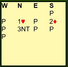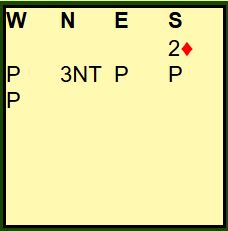 Åpningen med 2 ruter var svake 2 som du snart skal få se kan innebære en ganske bra hånd, nesten åpnings styrke (kjenner ikke helt N/S sine avtaler?). Hva spiller du ut?