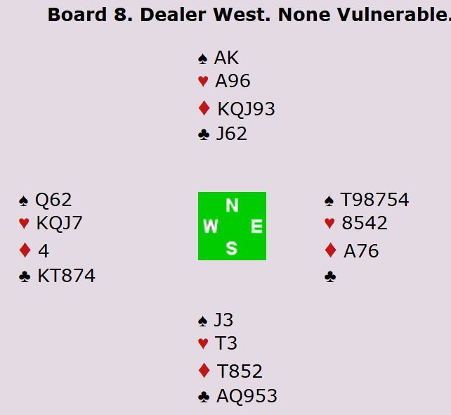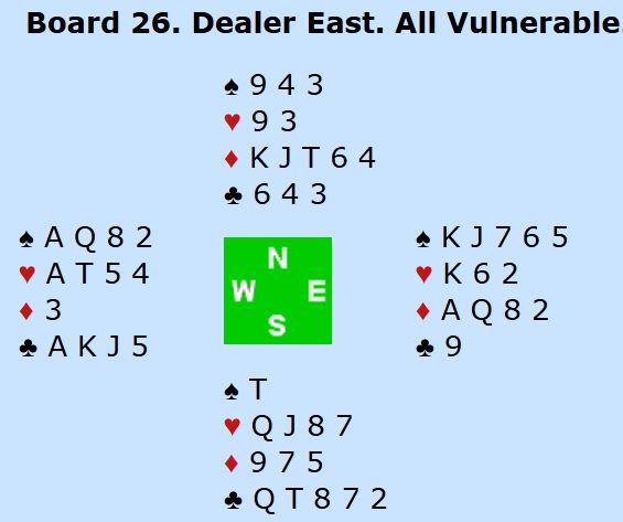 Vest ble altså spillefører, så det var nord som skulle spille ut. De fleste ville vel spilt ut ruter konge, men nederlenderen prøvde trumfkongen for å få se bordet før han skulle fortsette motspillet. Og utspillet var for såvidt godt nok hvis han hadde fortsatt med den andre sparhonnøren. Skjer det får ikke spillefører trumfet de to små ruterne hos vest og ender opp med to spartapere, en hjerter- og en rutertaper. Men Bjerkset fikk ruter i skift og fikk stjålet begge øst sine små rutere på den korte trumfhånden. Dermed tapte han kun stikk til A-K i trumf og hjerter ess og noterte +590, et nesten utrolig resultat siden motparten har 25 HP til sammen!