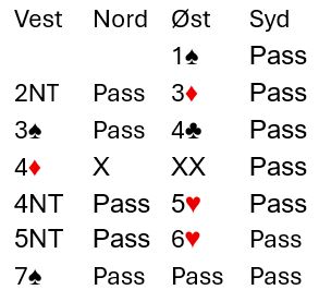 Stein Bjerkset (vest) åpnet med 1 kløver og nord doblet opplysende. Da hoppet Tor Bakke til 2 hjerter som lover sekskorts sparfarge (overføring, og jeg antar det kan være med varierende styrke). Syd passet, og Bjerkset hoppet til 3 spar før nord forsøkte 3NT. Bakke meldte da 4 spar vel vitende om god tilpasning, og nå syntes syd det fikk være nok og doblet.
