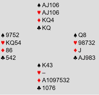 Og 4 hjerter ble en utfording. Hvordan ville du som nord spilt 4 hjerter etter et for deg hedig ruterutspill til vest konge og ditt ess. Det ser så opplagt ut å ta de to ruterstikkene og kaste to kløver. Men hva bør det spilles etter det er gjort?
