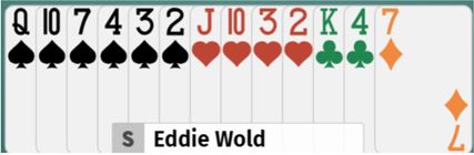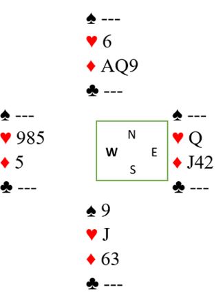 Uforståelig nok, vest spilte ut ruter 7 (norsk fordeling) ved det bordet også. Det gikk ruter 9, 10 og konge fulgt av spar ess og mer spar til vests konge. Det kom nok en ruter (!) til esset. Rutersitsen var nå på det nærmeste klar uten at det hjelper noe, det ser uansett ut til å være fire uungåelige tapere. Vest må ha rutersyveren dobbel, for om han hadde startet med fire ruter ville utspillskortet - syveren - vært det nest høyeste kortet. Inne på ruter ess ble kløver 10 spilt til vests ess. Han spilte mer kløver til østs konge. Ingen ting som koster noe har egentlig skjedd så langt, og de vil fortsatt få ett hjerterstikk mot slutten - betestikket - ikke sant?