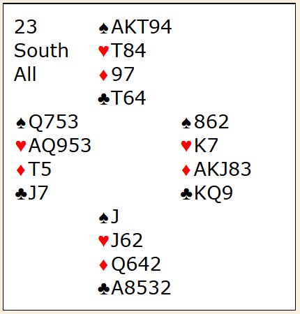 Alt er trist i dette spillet bortsett fra resultatet, +420. Utspillet ved begge bord er dårlig (men alle utspill kan jo være klaff), motspillene veldig svake, og skift til liten hjerter mot slutten er toppen på kransekaka. Øst bør se at han kan bli skviset, og hvis han spiller hjerter bør å spille damen være opplagt. Da holder vest hjerteren, og N/S går fortjent bet i den for hardt meldte utgangen.