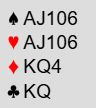 Du sitter syd og hører pass fra vest og 1NT (15-17) fra nord. Om du har fått plass ved det andre bordet hører du 1kløver, sterk, kunstig melding (16+ poeng) fra makker fulgt av 1NT etter ditt svar 1 ruter som viser mindre enn 8 poeng. Situasjonen er altspå omtrent den samme for begge på syds plass. Hva tenker du om dette, og hvordan melder du?
