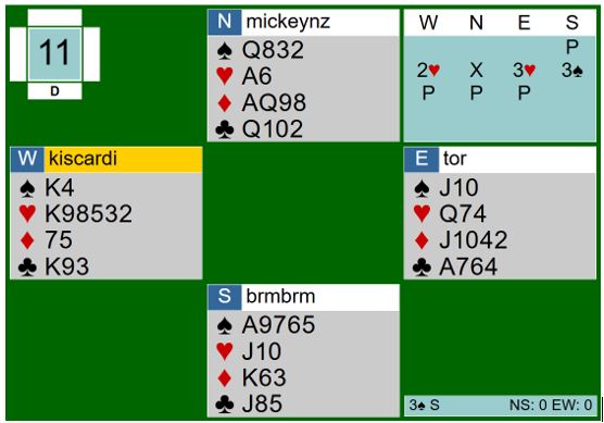 Ruter 7 kom ut, et ganske uforståelig utspill fra dobbelton etter at makkeren som du ser støttet til 3 hjerter. Men vest var heldig, øst hadde J-10-x-x og en sikker stopper, ikke for eksempel knekten tynt fjerde eller damen tynt osv. I så fall ville utspillet forært spillefører ett ekstra stikk. Siden øst fortsatt stoppet ruteren er det ikke mer en ni stikk med en taper i spar, en i hjerter (hjertertaperen kan ikke forsvinne) og to i kløver.