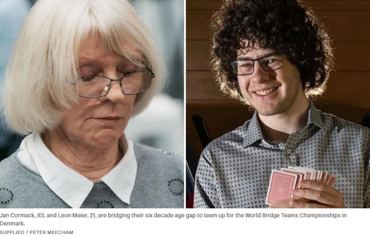 Som nevnt har Norge mange svært gode juniorspillere, både jenter og gutter med Nicolai Heiberg-Evenstad i spissen. Som 17-åring har han allerede debutert på det norske landslaget i åpen klasse. I New Zealand hvor jeg bor er det også en gruppe unge spillere som viser bra takter. En av dem, Leon Meier som jeg har spilt en god del med debuterte på landslaget i åpen klasse som 19-åring. I VM i Herning skal han spille i mix-klassen i et makkerskap som har en uvanlig stor aldersforskjell, kanskje en av de største i et verdensmesterskap? Leon har nå blitt 21 år, og makkeren Jan Cormack er 83 - mer enn seks tiår mellom det to i makkerparet! Snakk om "bridging the age gap"!