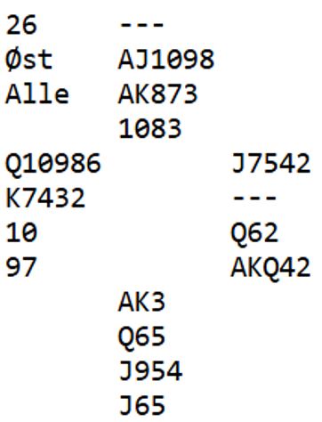 Siden N/S har 25 HP til sammen er det ikke så rart at mange ble doblet i sparutgangene. Ved seks av 16 bord ble resultatet 4 spar doblet med ti stikk, Ø/V + 790. Det ga "bare" +6 av 15 oppnåelige, og det var ikke delt topp. Ett par fikk nemlig overstikk i 4 spar doblet (+990) som kan skje om ikke N/S får med seg ruterstikket. Toppen Ø/V gikk imidlertid til Odd Erik Kvamseng-Hanne Grethe Morch som spilte 4 spar redoblet og vant den med ett overstikk! Det ga den uvanlige scoren +1480.