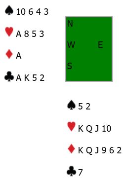 Vest hadde altså tatt de to første stikkene med hjerter- og ruter ess. Så kom øst inn i kløver etter den fine underspillingen av A-K-x-x, og i fjerde stikk kom en ruter fra øst til stjeling - en bet. Om motspilet ikke finnes kan den optimistiske utgangen fort fyke hjem.