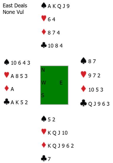 Her er et spill fra en lagturnering forleden som var litt interessant i meldingene. Det ble også en prøve for den ene motspilleren sånn som meldingene gikk ved det bordet jeg satt nord. Og motspilleren på vets plass var min makker til daglig, nå motstander. Han fant løsningen...