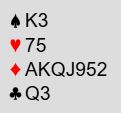 Å si 5 ruter er en mulighet, og det er vel hva mange ville gjort. Men er det sannsynlig at egen side har utgang? Kan det hende det ikke blir så hyggelig i 5 ruter? Om makkeren har null og nada, eller noen ubrukelige lavhonnører kan det bli mange bet i 5 ruter, kanskje doblet. Og makker kan også ha kort som gjør at 4 hjerter går bet mens 5 ruter ikke har noen sjanse.