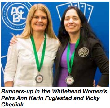 Det har blitt noen bra norske resultater i sideturneringer i San Francisco. Onsdag ble det også en topp-plassering i en av hovedturneringene, WHITEHEAD WOMENS PAIRS (onsdag). Der kom Ann Karin Fuglestad og Vicky Chediak på en sterk 2.plass i finalen bak et amerikansk par.
