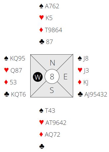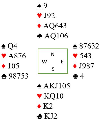 La oss si vi vinner kløverutspillet hos nord og spiller hjerter til kongen og vests ess.(Det ville blitt et spesielt spill om vest klarer å ligge unna to ganger med hjerter ess, men det lumske motspillet ser vi bort i fra i denne omgang). Idet vest har fått for hjerter ess slipper vi den kjedelige sparskiften fra øst, så vi har våre to hovedsjanser for det tolvte stikket i behold. La oss si vest spiller mer kløver (eller spiller hjerter), men det spiller ingen rolle hva vest spiller av hjerter, ruter og kløver idet han er inne på hjerter ess. Øst viser seg å ha startet med kun en kløver.