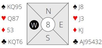 Vest åpner med 1 kløver. Øst har 11 HP så det mangler noen få HP for utgang siden åpneren har helt minimum. Men det er vel ikke unaturlig at øst tenker på utgang i dette spillet? Svareren har tross alt en god syvkortsfarge (ofte syv stikk). Men om Ø/V melder utgang går det galt denne gangen. Det blir betelass om motspillet er bra. Ø/V kan slik det sitter vinne delkontrakt, men da må de stoppe i så lavt som i 2 kløver! Havner de i 3NT kan det bli fire bet! Det viser seg at det er N/S som har høyeste kontrakt, og det med god margin: