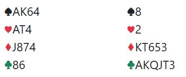 //At det faktisk står tretten stikk i ruterkontrakt bør ikke N/S bekymre seg særlig mye over om de kommer seg i 4 hjerter som i så fall vil gi en veldig god score. De blir neppe mange N/S-par som kommer i utgang med disse kortene.//