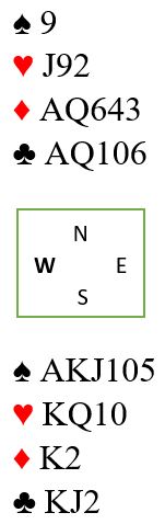 I dag tar vi med et spill som forekom under treningsspilling forleden. Som syd har du havnet i 6NT med disse kortene: